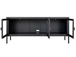 Ce meuble pratique et fonctionnel mesure 55 cm en hauteur, 130 cm en largeur et 40 cm en profondeur. Il est confectionné en métal noir et se dote de 3 portes vitrées avec des poignées de portes modernes et discrètes. Il est surélevé sur des pieds assez fins, ce qui apporte de la légèreté à l’ensemble.