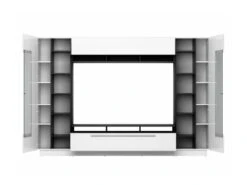 Cet ensemble est composé d’un banc TV : 180x30x40 cm avec 1 porte abattante et 3 compartiments, deux étagères murales: 120×2,2×20 cm, quatre blocs suspendus: 60x60x30 cm avec une porte pleine et 1 étagères à l’intérieur.