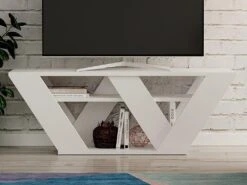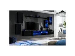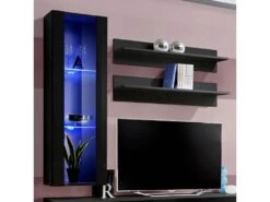 Cet ensemble est composé d’un banc TV avec 1 porte abattante et 3 compartiments, une étagère murale, deux colonnes suspendues avec porte pleine et trois étagères, deux blocs « cubes » suspendus avec une porte pleine et 1 étagères.