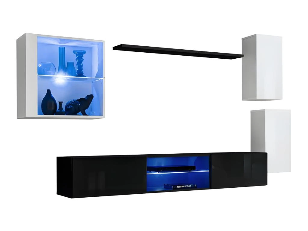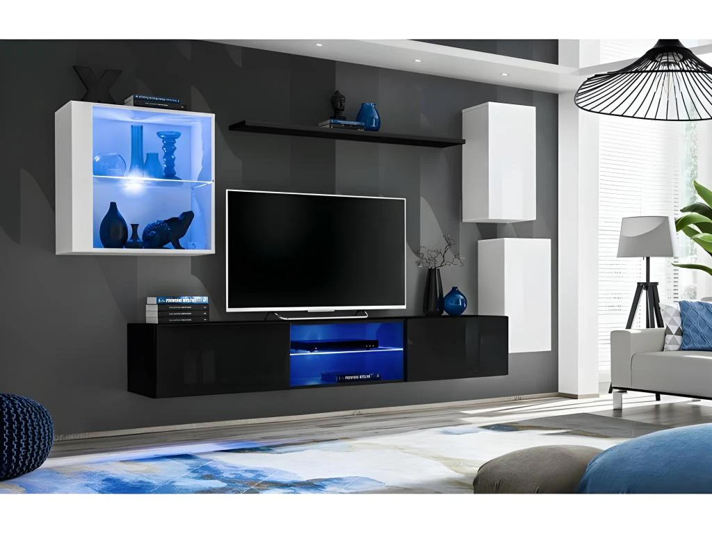 * Meuble TV et étagère : Corps du meuble couleur noir mat et façades noires brillantes. Étagère noir mat.
