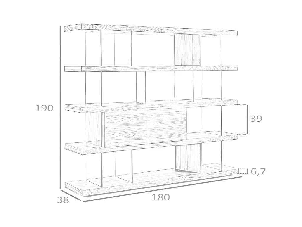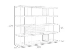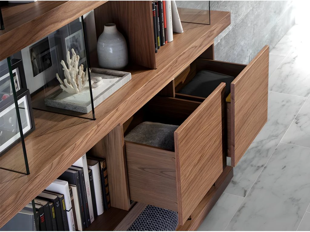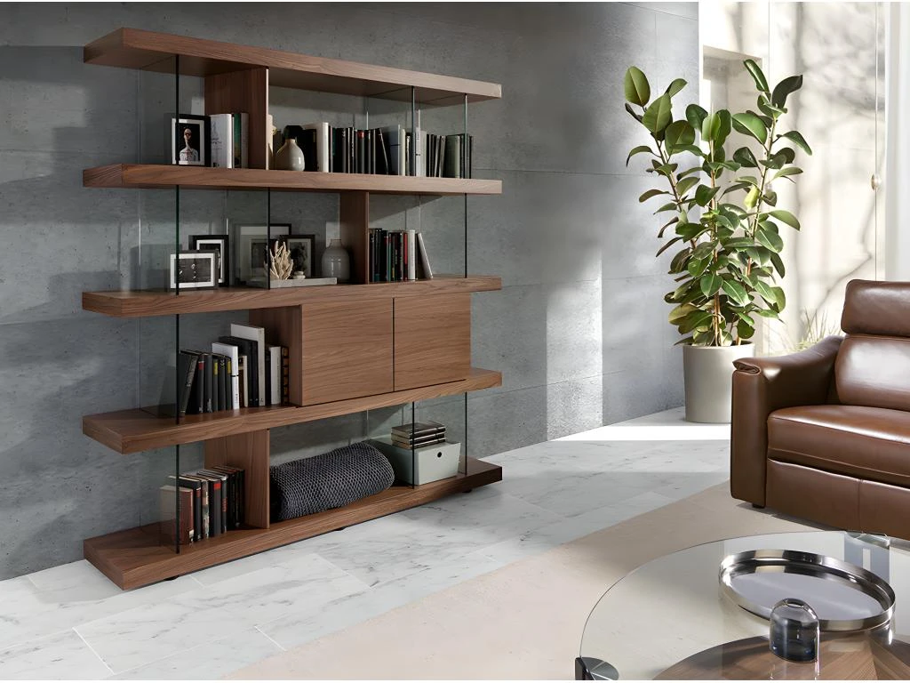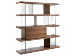 Bibliothèque au design moderne avec étagères irrégulières en bois plaqué noyer naturel de 0,5 mm d’épaisseur et verre trempé de 10 mm d’épaisseur. Une bibliothèque au design très original, parfaite pour apporter la touche de chaleur et de style que vous recherchez dans votre maison et tout garder en ordre, également grâce à ses deux tiroirs avec système d’ouverture par poussoir et fermeture amortie