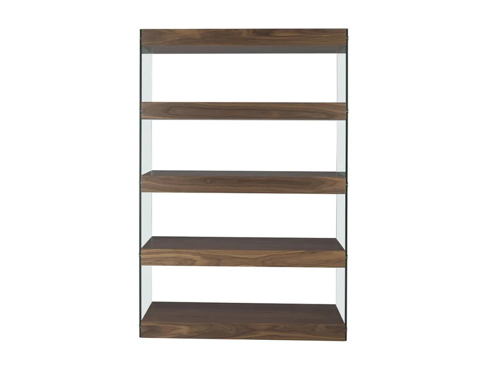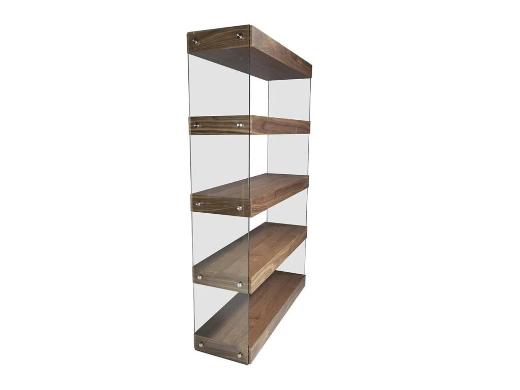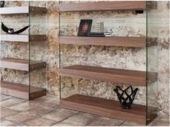 Étagère au design moderne avec des étagères de 40 mm en bois plaqué noyer naturel de 0,5 mm d’épaisseur, et des côtés originaux en verre trempé de 10 mm avec des bords polis. Un design modulaire parfait pour augmenter la sensation d’espace de votre pièce, ainsi que pour apporter chaleur et modernité, tout en gardant tout en ordre. La combinaison parfaite de l’aspect pratique et du design.