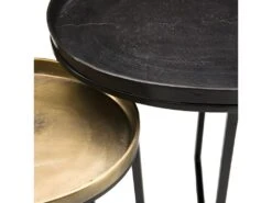 Set de 2 tables d’appoint ovales aluminium doré et noir – pieds métal noir. Dimensions : 47,5 x 30,5 x 56 cm. Article en Aluminium et Métal. Collection indéfinissable tellement elle resplendit par la noblesse de sa matière. En un clin d’œil, cette gamme aux allures orientales illuminera votre intérieur avec sa couleur dorée et argentée.