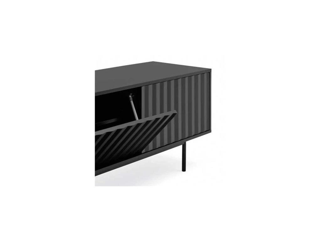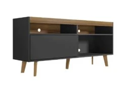 Une laque noire revêt l’ensemble du meuble pour un fort impact visuel dans votre coin TV et une intégration aisée au sein de tous les codes couleurs. Mention spéciale pour le design graphique de la façade de ce meuble bénéficiant du coup de crayon d’un architecte designer inspiré.