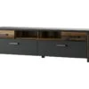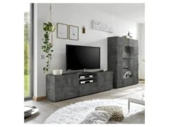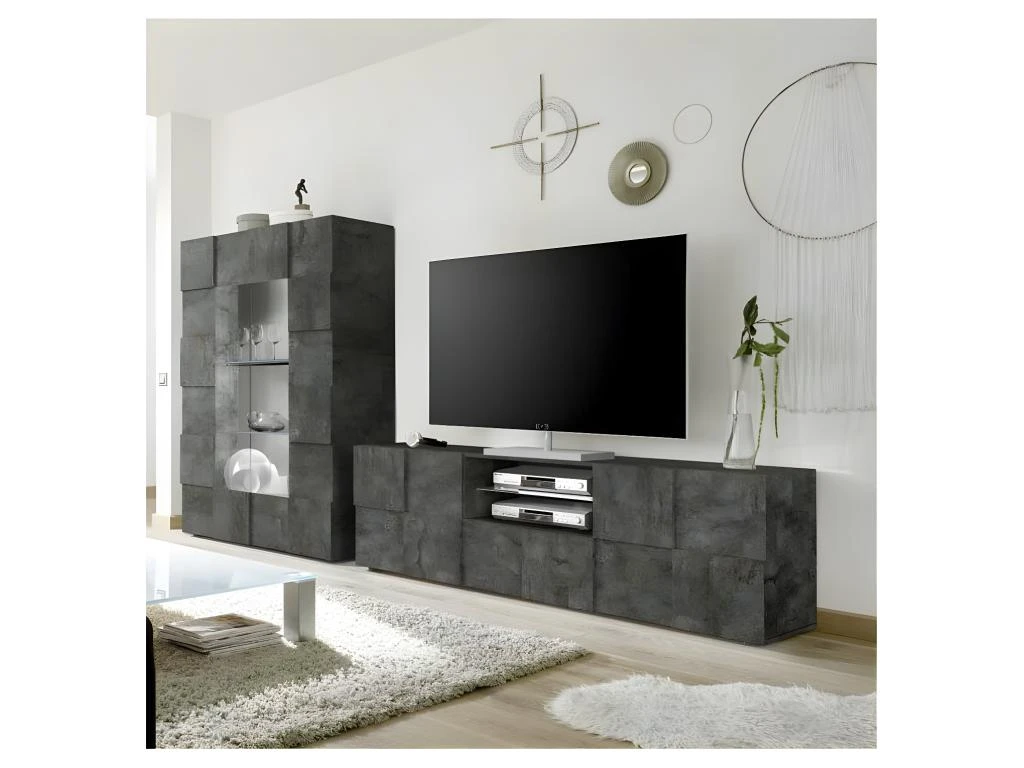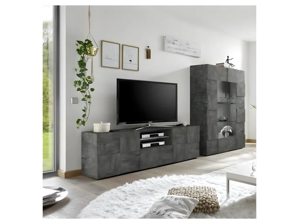 Les façades des ouvrants de ce meuble audio/visuel sont pourvues d’un damier en relief magnifié par la finition béton ciré foncé, bluffante de réalisme.