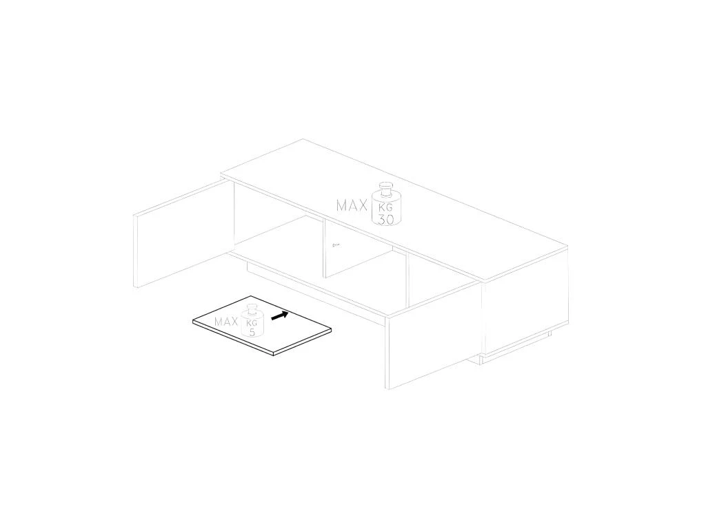 Le corps du meuble, posé sur un socle en retrait, met à disposition 2 grands volumes de rangement derrière les 2 portes et un espace 2 niches muni de passe-cables.