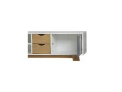 Solidement campé sur sur piétement réalisé en bois de Pin teinte naturelle, assorti à deux des tiroirs, ce meuble propose un corps mettant en oeuvre un très robuste mdf laqué blanc. Pour apporter plus de contraste la porte et les 2 grands tiroirs sont laqués gris.