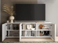La collection CAYNO est idéale pour l’organisation des rangements de votre séjour. En effet, elle est dotée de nombreux espaces pour organiser vos divers effets. Son style et ses couleurs sobres mais chics s’intégreront facilement dans tout type d’intérieur. Le meuble TV 3 portes ouvre sur 6 niches de rangement.