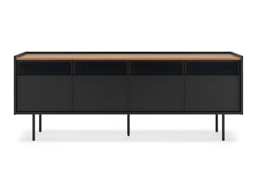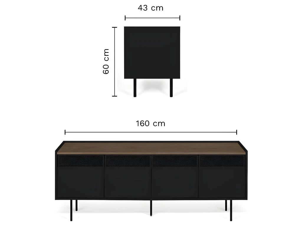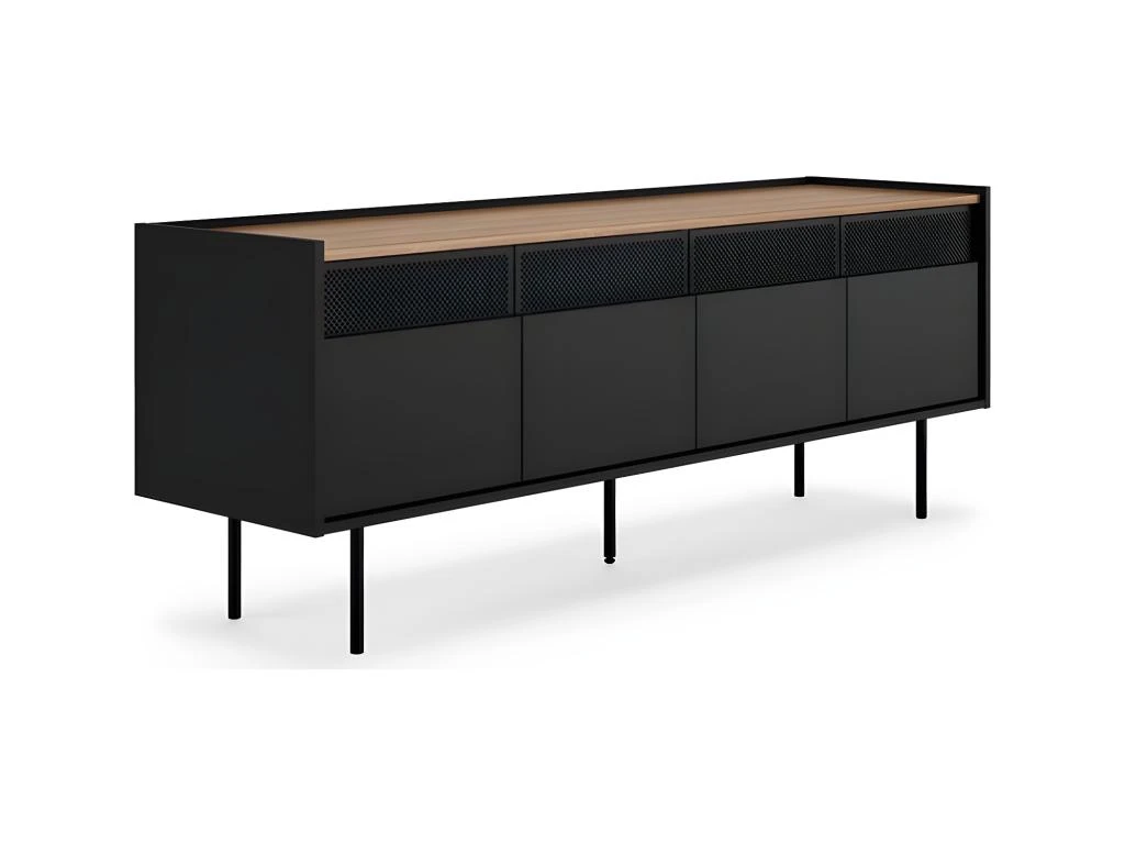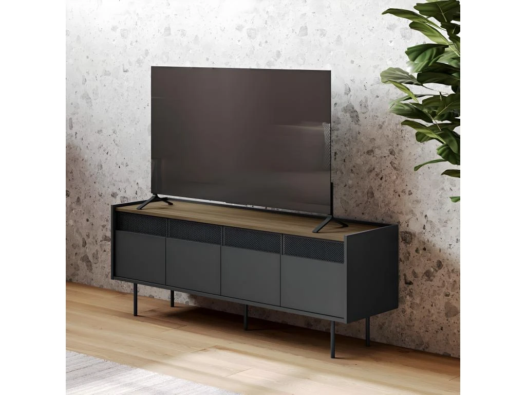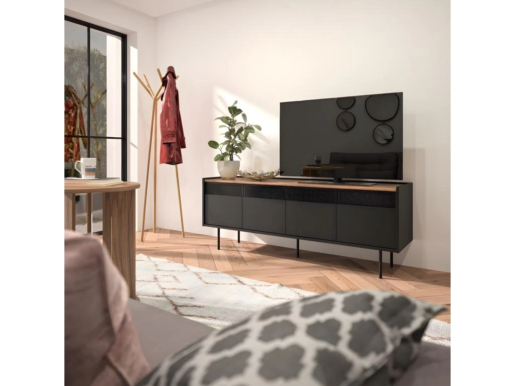 Avec son design dynamique, le meuble TV RADIO offre de nombreux rangements cachés, 4 portes, 2 armoires avec une étagère à l’intérieur. Les grilles métalliques permettent au signal infrarouge de votre équipement audiovisuel de passer.