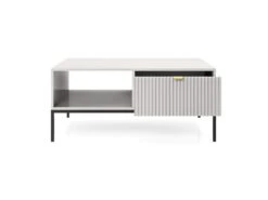 La table basse Vellore avec tiroir est un moyen de créer un coin salon attrayant et fonctionnel dans votre appartement. Le plateau de table spacieux vous permet de placer facilement une assiette avec de la nourriture ou une tasse de thé, grâce à laquelle vous pouvez recevoir confortablement des invités dans votre salon. Un tiroir et une étagère pratiques s’avéreront irremplaçables pendant la soirée de détente – vous pourrez y ranger tout ce dont vous avez besoin pour passer un bon moment. Par conséquent, non seulement les petits appareils électroniques sous forme de téléphone ou de tablette trouveront leur nouvelle maison ici, ainsi qu’un paquet de collations, une boîte avec des lunettes, des livres ou des télécommandes pour divers appareils disposés dans la pièce. Vellore se concentre sur une forme simple et géométrique avec une forme rectangulaire assortie aux coins et aux canapés. Une solution intéressante s’est avérée être l’élégante rainure placée à l’avant, qui, associée au cadre en acier, diversifie bien l’ensemble de la structure.