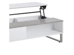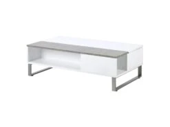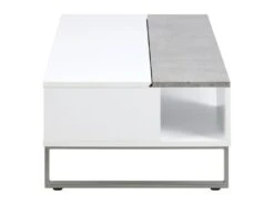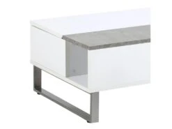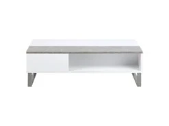 La table basse Kostrena est un petit meuble fabriqué en panneaux MDF. Avec son piètement en métal chromé et l’élément imitant le béton sur le plateau, Kostrena constitue un joli exemple du meuble réalisé dans le style contemporain. Le produit est équipé d’un rangement caché sous son plateau relevable et d’une niche ouverte sur le côté, en créant l’espace parfait pour ranger de petits objets qui encombrent votre salon.