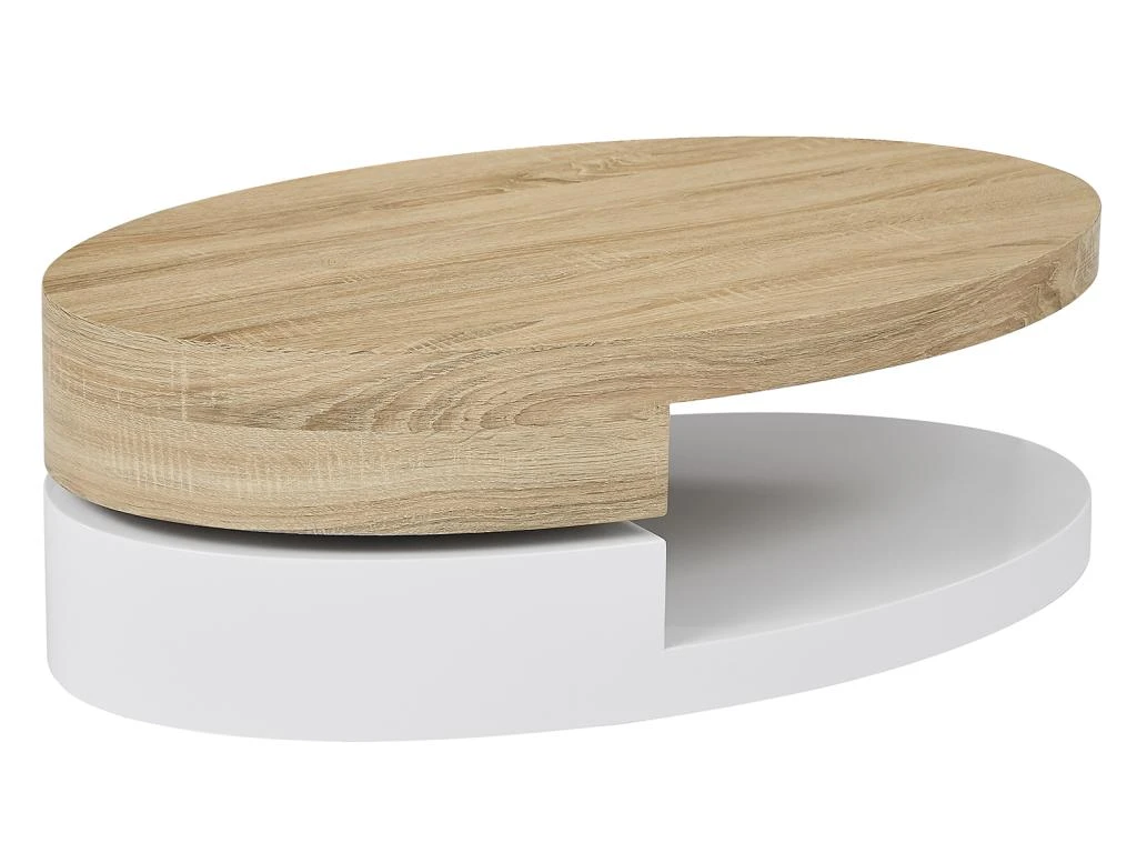 La table basse VITALY est à la fois un meuble pratique grâce à son plateau pivotant à 360° et un élément de décoration épuré pour votre séjour. En effet, sa combinaison symétrique de MDF coloris naturel vernis en haut et de blanc laqué en bas forme un contraste parfait.