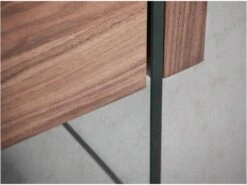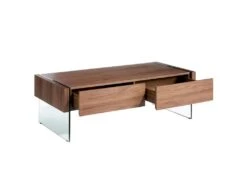 Table basse au design moderne avec plateau en bois plaqué noyer naturel de 0,5 mm d’épaisseur, avec un design élégant et original de pieds latéraux en verre trempé de 12 mm et de bords polis. Grâce à ses deux tiroirs avec système de fermeture en douceur, vous pouvez tout garder en ordre. Cette table d’appoint de notre nouvelle collection apportera chaleur et style à votre pièce, ainsi qu’une sensation de table flottante grâce au beau design de ses pieds en verre