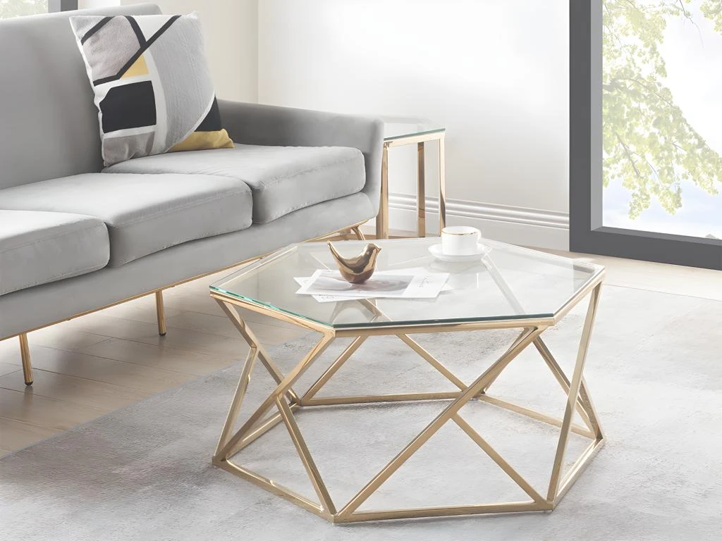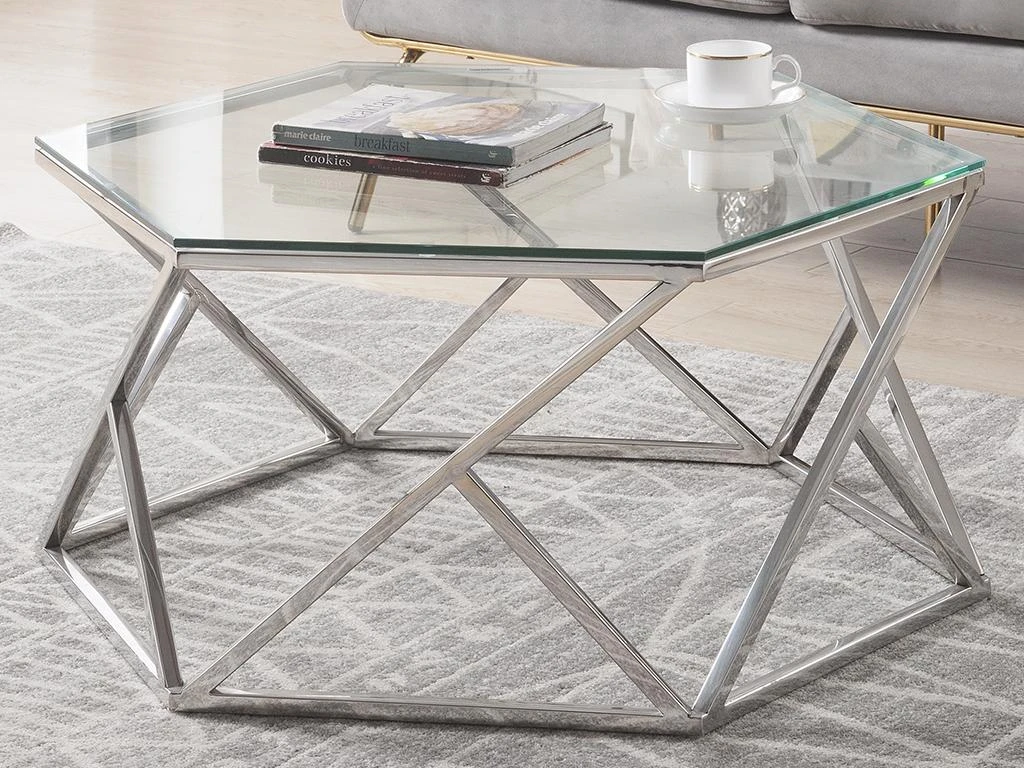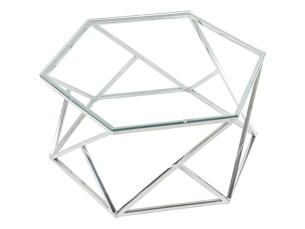 La table basse KERIANE est composée d’un plateau hexagonal en verre trempé et d‘un piètement en acier inoxydable. Ces deux matières s’équilibrent parfaitement entre elles et dégagent une impression de légèreté.