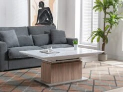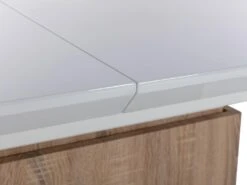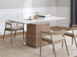La table 2 en 1 CAPANI possède un plateau extensible en MDF blanc laqué. Celui-ci est soutenu par un pied relevable en acier inoxydable recouvert de MDF au coloris noyer disposé sur un socle en acier inoxydable. Avec cette table réglable à la fois en mode table basse ou table à manger, les invitations de dernière minute ne seront plus un problème !