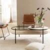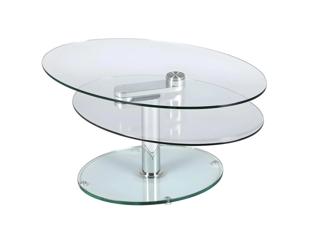 Mélangeant l’acier et le verre, cette table basse contemporaine vous offre deux plateaux pivotants vous offrant une surface modulable en fonction de vos besoins. Piètement en acier chromé. Plateaux en verre trempé ep. 12mm.