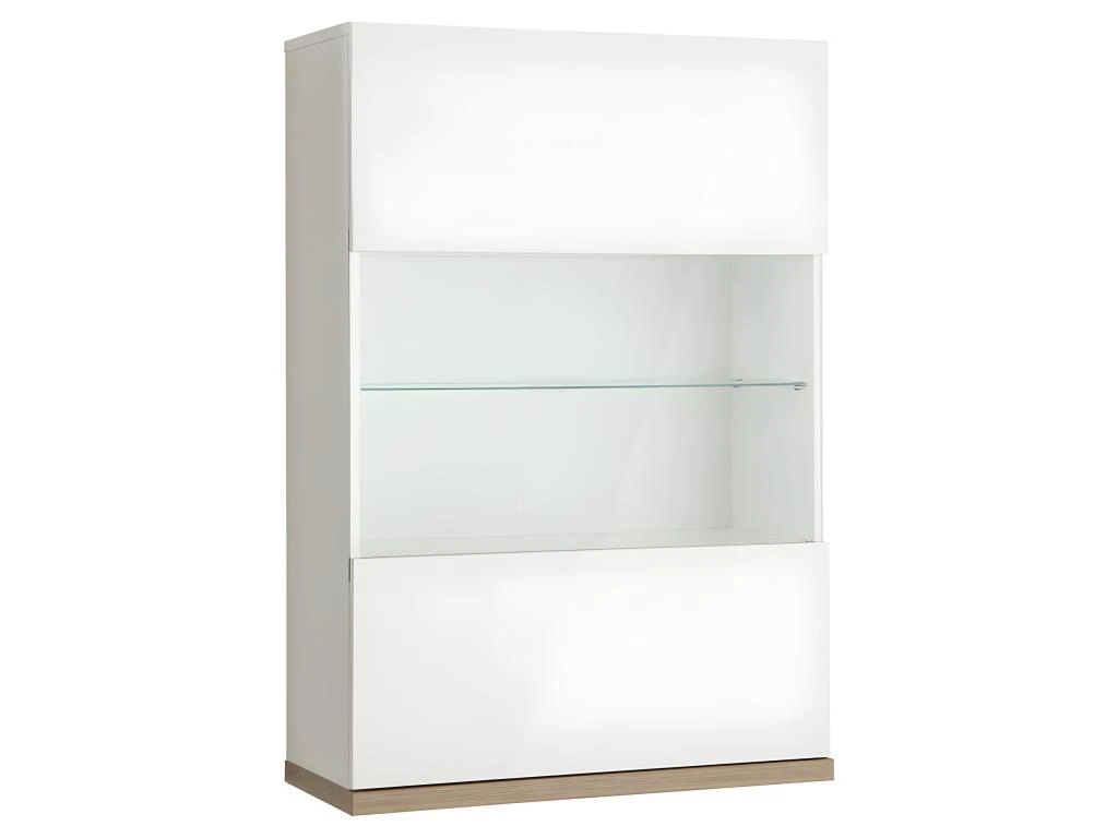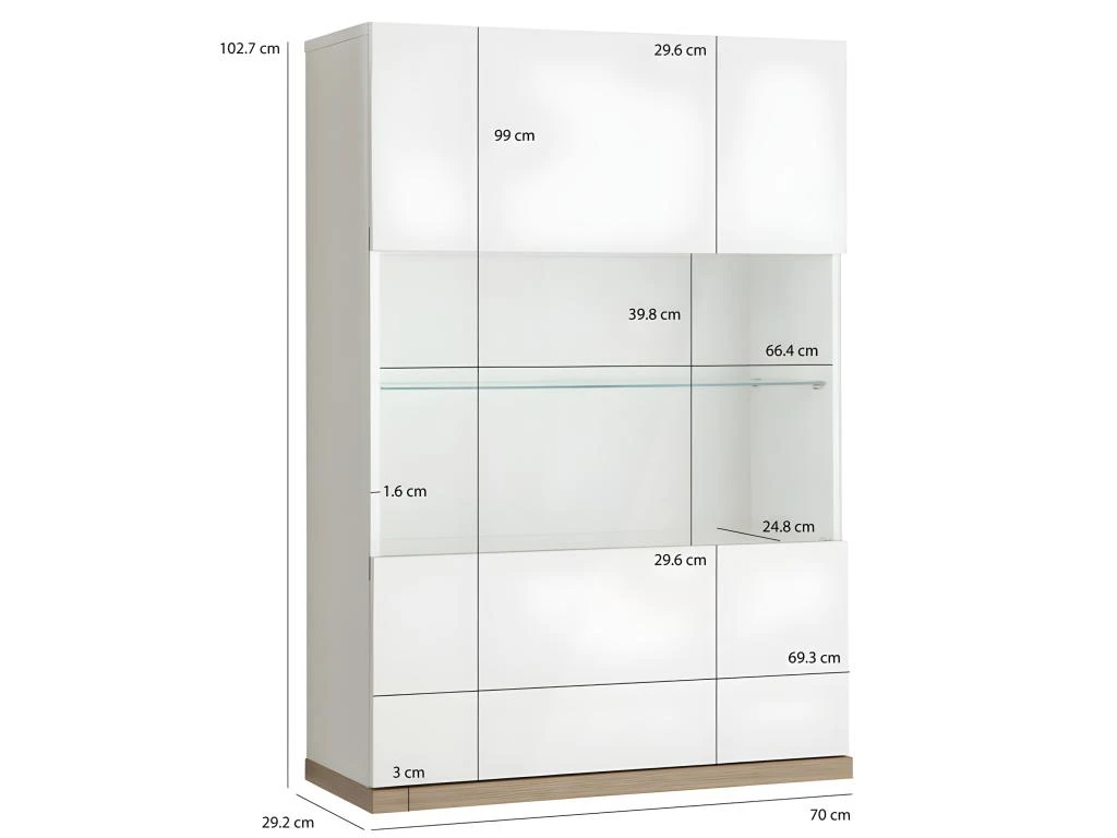Cette vitrine murale vous permettra de ranger vos affaires sur ses étagères derrière ses portes, mais également d’exposer des objets de décoration au-dessus du meuble et sur ses étagères derrière la partie vitrée d’une des portes afin de parfaire votre intérieur. Un mariage parfait entre couleurs claires, sa finition blanche brillante viendra éclaircir la pièce tandis que la petite finition bois clair apportera une ambiance chaleureuse.